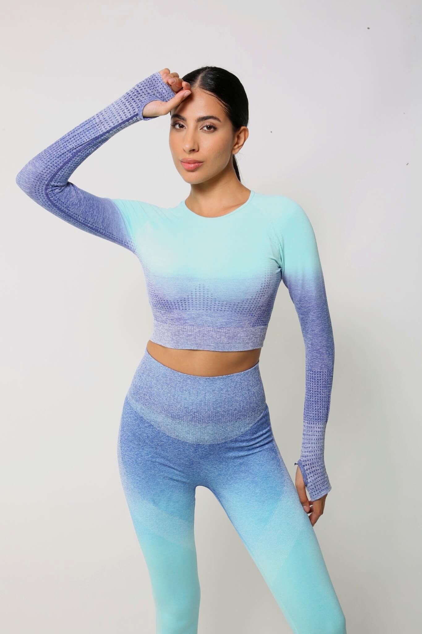 Uzun kollu crop top, dikişsiz teknolojisi sayesinde rahat ve esnek bir kullanım sunar.